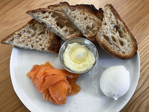 We've eaten at Nemesis Coffee in Gastown and was not impressed with the food, coffee or anything else. The red tomato-shaped roof of Nemesis Coffee at Great Northern Way drew us every time we drove past. The sun umbrellas and tables they've placed outside seem to promise a leisurely coffee time in the sun under the shade, so we stopped by last Sunday. Our first surprise was the long line up to the order desk. With the offices in the area probably closed on a long weekend, we thought this location was out of the way enough that it would not be busy. The menu suggested that there would be a weekend special, our second surprise was that there wasn't any Weekend Feature that day. So, we made up our own a la carte plates: Plate 1: Toast & Butter with sides of poached egg and smoked salmon. Plate 2: Poached egg, bacon, hash brown and greens. Our plates turned out to be really well presented and a delightful treat. There were empty tables in the sun, but without umbrellas. So, we ended up with a table inside. The third surprise was that the service was exceptional. Two glasses of water were delivered to our table the minute we sat down. Our coffee drinks arrived shortly. We were able to watch the barista make the drinks with precision and confidence. As much as we are not fans of coffee drinks served in glasses, the drinks were well poured and the microfoam was excellent. The prompt arrival of the food was the highlight. Our food was so well plated. The eggs were precisely made, and not cold(!) My hash brown was so yummy I was tempted to order a second one â and would have done so if the lineup at the order desk wasn't so long. I was very pleased to be able to get some greens with my food. The sound level in the interior space was very 'live' â the hanging fabric in the ceiling was not quite thick enough. To describe the place and our overall experience, we both came up with the word 'CLEAN', 'PRESTINE'. Why? The food left us feeling really comfortable, without any nasty side effects even though we ate deep fried hash browns, bacon and toast, etc. The staff is very diligent in cleaning the tables and counters. The barista was very cool and controlled. We have been visiting this places almost weekly since discovered it. I finally gathered enough courage to try the Banh Mi Fried Chicken sandwich because it contains garlic and I didn't know how my body would respond. Well, it's easily one of the most tender, juicy and lightly crunchy fried chicken I've tasted, and thank goodness, the garlic was not noticeable, perhaps it was black garlic. But the sandwich was so huge and unladylike I felt kind of embarrassed. The potato bun was interesting. I was so full afterwards I decided that I would go back to my al la...