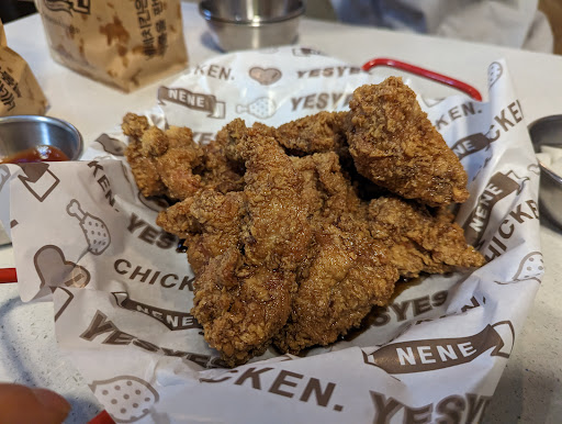 Read moreIt's been two weeks since ce I ate at NeNe Chicken on Davie Street. I can STILL hear the non-stop NeNe Chicken song and see the accompanying dance moves ( yes,dance moves) that were on a repeat cycle on the blaring TV in the small place. It was non-stop alternating Korean ads for their Chicken. Interestingly you NEVER really see the chicken. I was there by some bizarre twist of fate as I'm vegan. They had a sidewalk sandwich board saying they make VEGAN CHICKEN too. Weakened from my last months struggles I went in. I was the only one there and ordered to eat inside. I sat down,was brought something that looked like wet sugar cubes that turned out to be pickled turnip or something. Very sweet,it was crunchy and to me, totally new. My vegan chicken arrived and was basically a massive order I could have shared with four others. Just "chicken", no potato or other sort of vegetable that might accompany Western chicken type places. It wasn't bad. I had a grin on my face from trying to understand the very childish ads for NeNe chicken....Are there any Korean ADULTS? It was very weird. Fo instance, a Korean guy wirh dyed reddish blond hair, who was supposed to be Trump (?) discovered how "delicious" their chicken was...girl groups in tiny skirts that tried to emulate British school girl uniforms, all dancing about.... the chicken! Boy bands with at least 30 members all "very individual" dying their hair blonde or wearing nailpolish(?) all probably very famous in Korea.....it was annoying at first, then quite funny. After an hour of this type of "too happy" I'd be ready to slit my wrists though. Will I be back? No. But was it good? It was okay. Maybe good for take-out but there are much better options, more serene environments, Thai places for instance, nearby that give you a much more complete meal and much tastier,nearby. Quieter too!! I mean, go...