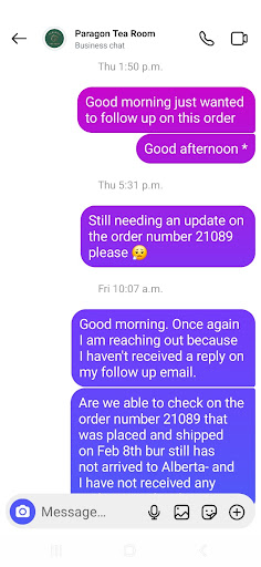 On Feb 6th I placed an order from Alberta and received a shipment confirmation and tracking number on Feb 8th. Did not receive anything by 13th and I realized that the tracking number was not updating any information so I reached out to Paragon via email for the first time on the 13th.