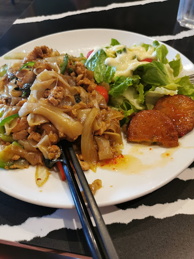 Interesting cafe serving hot Thai and Thai-fusion entrees along with coffee and some pastries. It's kind of a pricey place for a quick-serve cafe but the entrees are big enough that you can easily get two filling meals out of them so you do get your money's worth. The staff is welcoming and will take the time to explain the menu to you. Food is really good and even the grab-and-go entrees are actually hot and fresh. Highly recommend the Thai green iced tea. The only improvement they could make for me is to include some vegetarian options in the grab-and-go entrees. There's plenty of veg choices on the menu for the sit-down restaurant they're still developing, but none of these make it to the grab-and-go (at least not for hot food, I didn't check salad but vegetarians might have more...