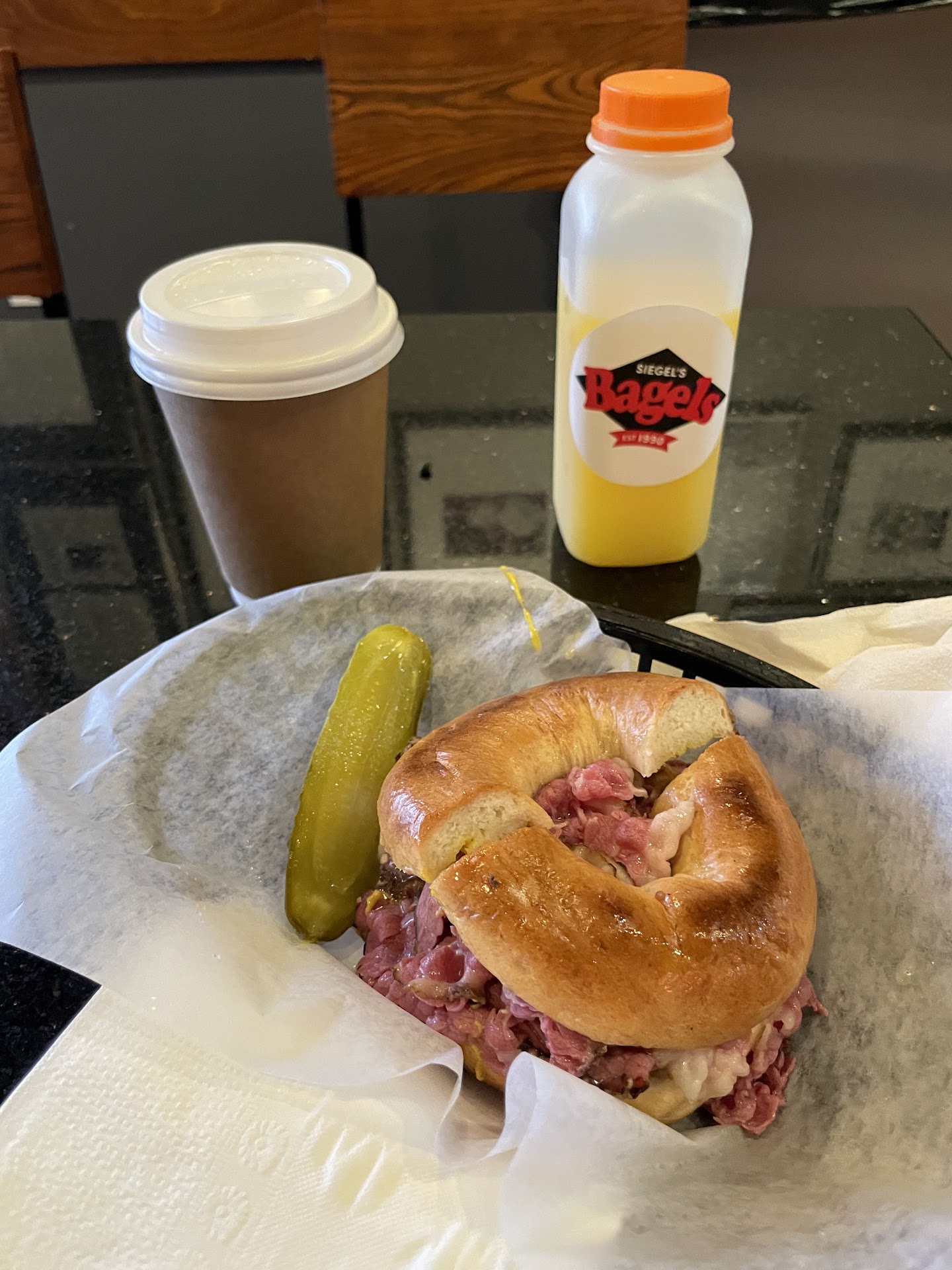 Read moreTonight we ordered 3 bagels: Plain with Plain Cream Cheese, a Reuben on Plain and a Vegetarian on Whole Wheat. Where my disappointment begins is with the Reuben; as seen in the photos posted, the Reuben was not what I expected as it was made on the tiniest bagel, with very minimal meat and toppings. For $13, this Reuben had zero quality and substance to it from what I would expect a Reuben to taste and look like. To add to the disappointment, all three bagels ordered were dry and hard as rock, to where biting into the bagel made the sandwich as a whole unenjoyable to eat. We ordered late, at about 12am, and were the only customers at the time we ordered and it took about 30 minutes to receive our bagels that did not look or taste like they were made with care. I would think that the quality of the food would be consistent throughout the 24 hours that the store is open and I would assume that even at 12am I would have still gotten a nice sandwich on a fresh tasting bagel. The only positive about this whole order was that the veggies on the Vegetarian were fresh, but because the bagel was dry and hard, the very few veggies were taken off the bagel and eaten on its own. I've ordered from Siegel's in the past and was never disappointed until tonight, so hoping that this is just a one-off, but tonight I sadly wasted $34...