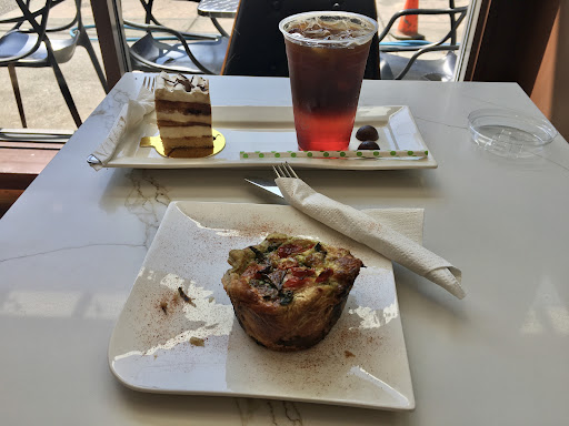 Read moreThis cafe is kind of unassuming from the outside - you might not notice it if you didn’t know to look, but I’m glad I discovered it! It’s run by a nice couple and the woman who took my order was helpful with my questions. It was hard to choose a savoury item because the quiches and sandwiches all looked great, but I ended up going with a tomato and basil quiche, which I was really happy with - the filling was great, but what really impressed me was the fresh flakey pastry crust. Choosing a dessert was easier because I saw they had tiramisu cake and I am easy to win over with tiramisu, and this lived up to my expectations. The cake also tasted very fresh and I loved the fluffiness of the cream. I wasn’t crazy about the strawberry espresso tonic that I had to drink - the espresso tasted sour (which I think was the espresso and not the tonic, but I don’t get espresso tonic often so I could be wrong). My total was about $20, I would say their prices are reasonable for the quality. Their muffins looked so good and I’m sure I’ll be back...