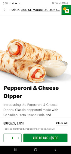 Get home to discover it looks like it was run over by a STEAM ROLLER (Made wrong). Instead of her rolling it up like a ROLL she made it in like a 4 x 6 in FLAT, and because TOASTING IT is part of it... It resulted in a complete HARD AS A ROCK (BRITTLE like a RITZ CRACKER) piece of greasy dripping CRACKER.. sandwiched between 4 pieces of Pepperoni DRIPPING WITH OIL.. didn't even put the CHEESE... I got NO DIP SAUCE (Selected MAYO) .. And to make matters worse, I only got 1 PIECE!?!
