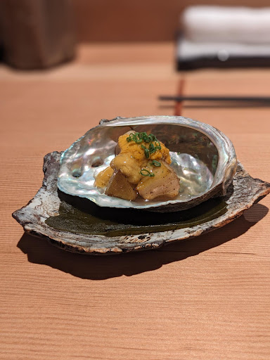 It was also obvious that some plates received more generous portions going to the chef’s friends. For example, the first dish was abalone topped with uni. While it was being prepared in front of us all, there were clearly more uni placed on the friends' plates than ours. The chef spent most of the evening interacting with them and only briefly checked in with us once asking how the food was so far. Later I overheard him mentioning that he was happy to reconnect with old friends, which is understandable, but it highlighted the uneven hospitality.
