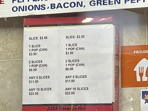 Ā Ā Ā Read moreWhat the hell happened to this place and the prices and the portion sizes and the cleanliness of this place and the customer service 3.50 for a super small super skinny slice you can eat in 3 bites with barely any sauce or cheese now and 35 dollars for 10 slices and 2 dollars for a pop can and 6.50 for a 2L of pop thats a straight joke 6.50 plus tax almost 7 dollars for a 2L of pop plus that 35 dollars is for 10 slices thats 10 slices from the warmer window not even a fresh made pizza plus they got no walk in or pick up deals and do the people that work there know how to clean or not give a shit cause this place is dirty and grimy as hell I went in today and it will be my last time ever I paid 10.50 for 3 slices of pizza that where super small super skinny dry and hard with barely any cheese barley any sauce and taste like cardboard plus the crust was like a brick plus the guy serving the pizza just threw the plate with my slices on it on the counter dident say a word and walked off oh and dont get me started on there bottles of ranch it smelt sour and off and there bottle of ketchup I used was rank so old you can go to fresh slice get a medium pizza with unlimited toppings for 12 dollars 12.60 after tax or a xl pizza with unlimited toppings for 22 23.10 after tax a fresh made pizza not warmer slices and you aint gonna pay 6.50 almost 7 dollars for a 2L of pop even little ceasars has better pizza then this place now what the hell happened because this was my go to spot for years and the pizza was so good now this place sucks and the pizza is god awful and the prices are a joke so overpriced and the place is a dump super great pizza there is nothing super great about this...