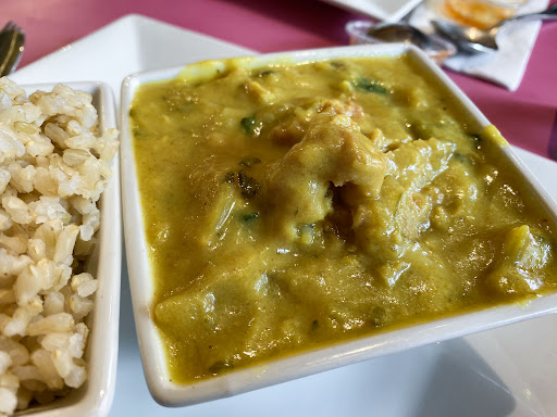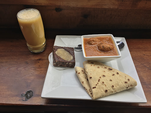 Vegetarian and health-oriented Indian food - was this place made for me? I came to check out the restaurant for lunch and was then intrigued to check out the grocery store after. The "restaurant" is actually more of a cafeteria, where you order and pay at the counter and bus your own table. The service wasn't particularly enthusiastic, but they weren't unfriendly either - just don't expect the above-and-beyond hospitality that you might want from a full-service restaurant. But I like the chill, modest atmosphere, and the patio seating especially has a nice feel to it. They have Indian veg dishes, soup and sandwiches, baked goods and raw bars/desserts, smoothies, and tea/coffee. The selection of dahl and subji has many choices that are different from the usual veg dishes at Indian restaurants which is nice to see. I got a light meal of a small pea kofta subji, a chapati, a ginger square, and a mango lassi. Overall I was very happy with my choices. The subji was not too oily and for being a mild spice level, was flavourful enough. The koftas had a great taste and texture. Since these curries are not made to order, they probably have to keep a mild spice level to please everyone, so you can't expect the same intensity as Indian restaurants where they cook to order, but this was still tasty and very easy and pleasant to eat. The chapati was warm and, while probably not cooked on the spot, tasted fresh. The ginger square was great - it was very much like a fudgy brownie with some texture from the nut pieces, and the big slice of crystallized ginger on top enhanced the flavour without being overpoweringly potent. The mango lassi was a little thinner and milder than I am used to, but had a good smooth mouthfeel and natural taste, and made for a nice light refreshing beverage. I would be curious to try their vegan cashew mango lassi and see if I like that better - I didn't notice that they had it until after I'd ordered. I think the price of my meal was totally fair: it was $17 total, and while the portion of subji was not admittedly not as large as the average curry size at an Indian restaurant, it was the perfect size for me, and the overall price was a lot lower than what I usually end up paying for a curry with bread, drink, and dessert. With the restaurant, I think if you try to judge it the same as you would a sit-down, white tablecloth Indian restaurant, you'll probably be underwhelmed, but I looked at it as a casual and quick grocery store cafe, and for the setup, I think what they offer is very good. Same attitude goes for the service - I do not need the cashier at this sort of place to treat me like family like the best restaurant-owners do, I just need them to take my order and my payment and generally be pleasant about it, and they were. Because most of the food was ready to serve, I didn't have to wait very long to get it. From the outside, it doesn't look like they have an efficient system for serving customers (multiple people in the kitchen but they don't seem to have specific jobs, instead doing whatever task comes up, so sometimes there's no one at the register), but I wasn't bothered by it since, again, speed of service after ordering was still pretty quick. The grocery store has a great selection of vegan and natural products, and I ended up buying a few drinks, a few protein/snack bars, and a package of veggie wraps, but I wasn't paying that much attention to the prices while I was shopping and it somehow came to $40. I was thinking the cashier must have added some item twice, but the screen with the list of everything they rang me up for was correct, it's just very expensive. Because of that, I will not be doing more casual shopping there again except for maybe coming back for the wraps that I haven't seen elsewhere. I was torn between giving 3 or 4 stars, but I do feel a very strong pull to visit the restaurant side of the business again, which I feel like a 3-star review would not reflect. So 4 stars it is for a cool little vegetarian...