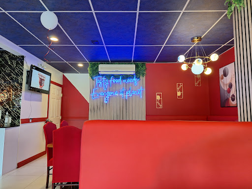 The exterior is fairly unassuming and doesn't really match your expectations of the interior. As you head inside, you're greeted with a clean and bold looking establishment with bright red seating and some unique decorations. I will say that it's a little tacky, especially with the fake neon sign and the two TVs that don't add much to the experience.