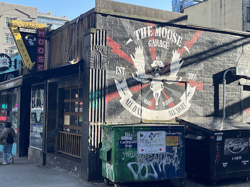 My husband and I went to the Moose Bar and Grill which, after we researched on the internet, was within 3 blocks of our hotel. The food was good. The chicken wings in a sweet maple sauce were enough to share and enjoyed. My husband had one of their BBQ burgers with fries and I had the Rice bowl with vegetables in misu sauce sans zucchni. It was very good, came in a unique bowl and was just the right amount of food to leave room for the CanadianAmerican nutella and m&m's Desertwich. This last indulgence was enough for two people. Yum! The service was questionable at first, as our waitress brought my water with two melted ice cubes. The place was hot after our walk in the beautiful Vancouver sunny weather, (although they did turn on fans later on) and we requested more ice. As the evening went on, however, she warmed up to us, and even visited with us a bit while we paid, using the credit card scanner that was brought to our table. We appreciate that technology being used for security. The bar itself is truly a sports bar with multiple TV's on, last night showing endless video of skateboarding (not necessarily professional or competitions). There is a unique wall of stereo speakers of various sizes through out the ages, and a number of speakers mounted that were blasting out music, my guess is from the videos. One juke box like screen was posting interesting trivia, which we enjoyed. The crowd was made up of mostly young adults, and I would guess that is why it is a place we will not return to, as we are much older, and cannot hear as well...