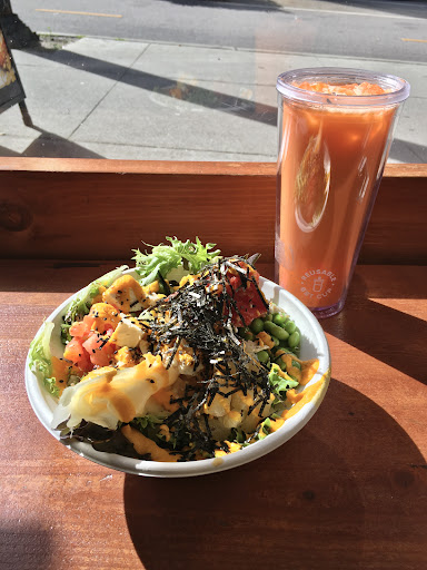 Read moreJust tried this location on Richards St for the first time, but I've also been to the Howe St location. The venue on Howe is a little nicer (it's very bright and open), but this building is also a nice comfortable hideaway to relax and enjoy some poke in. The only big difference is that this location just started serving bubble tea, which is what made me come here this time. I got "da bruddah bowl", which is a vegan poke bowl that actually includes vegan tuna! I haven't tried a lot of vegan fish before, but the ones that I have sampled tend to have a bit of an jelly-like texture because they're made with agar, which I don't really like, but I didn't pick up on that texture here, maybe because it was finely chopped. So I was pretty impressed with it - I actually don't think I would have noticed that it wasn't real tuna if I hadn't known. Vegan tuna aside, I also really enjoyed the other components of the bowl. It was fresh and the carrot ginger dressing was great! I tried the papaya latte to drink, and I was also pretty impressed with this. Creamy papaya flavour and lots of chewy crystal pearls. They were able to make it in the reusable cup I brought. The staff were great. They were nice to me, but while I was eating, so many customers came in with lots of questions and they were really patient...