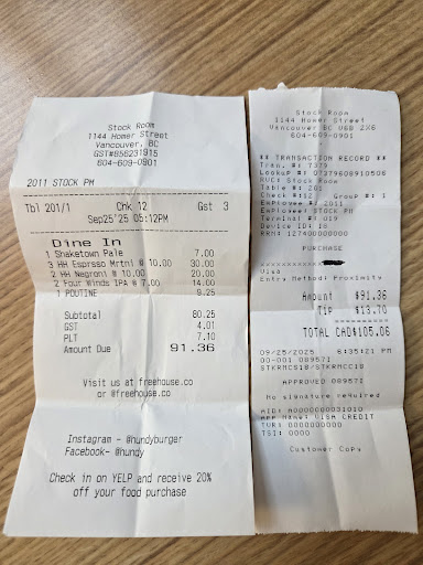 First time visiting Stock Room for happy hour at 5 pm on Thursday, Sep 25, 2025, and won't recommend it until they maintain professionalism and mutual respect. Was excited to try this until your disgruntled bartender [caucasian lady who behaves like she doesn't want to work for your company] keeps raising her voice at me for no reason when I asked for beer recommendations; "what beer do you want?!! Hazy or non-hazy?!... look at the menu!.." Your bartender also repeatedly interrupted my conversations with my colleagues almost every 15 minutes without saying "excuse me" until a different server took over. What kind of speak easy are you selling? My interest at any speak easy is to chill and speak with colleagues after a busy work day while also making sure the drink bill is reasonably large enough to give a business like yours the respect it deserves. Your management team should train your staff properly. I am not interested in paying over $100 for drinks and tip to tolerate your bartender's behavioral problems. I tolerated it anyways because my first visit is also my last visit. I don't think anyone is interested in this kind of experience.