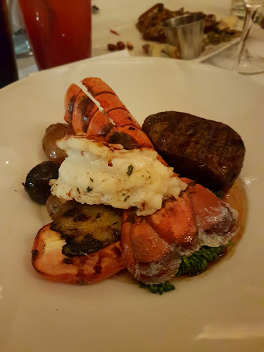 For our entrees we enjoyed the Steak Diane. It is a fabulous tenderloin “Diane” style. I’ve never had it but it was great. The sauce was a good balance & just right. It went nicely with the steak. It came with some seasonal vegetables, greens, broccolini, full size carrots & a potato pave. The other was a Crab & Shrimp crusted Halibut. It was cooked perfectly. It seems like it can be a challenge to get fish done just right. The Chef did not disappoint. The fingerling potatoes was skin on buttery & melt in your mouth.