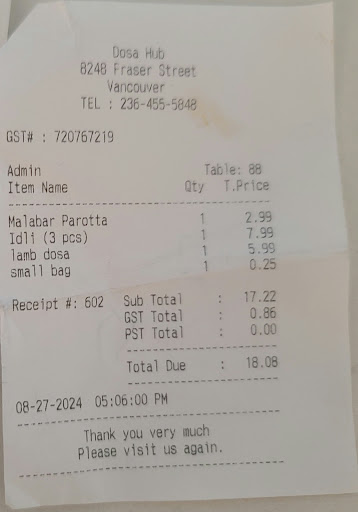 Read moreExtremely disappointed with my visit to Dosa Hub this afternoon. A few weeks ago I arrived at 5 pm and was served the non veg thali. However, today when I arrived at 5 pm, the waitress appeared very confused and told me that the thali was only available at lunchtime. I had driven from quite far away and was very disappointed. No consistency at this restaurant. Kindly train your staff to be accommodating to their customers. Being flexible to your customers is key to survival in Vancouver where there are lots of good choices in Indian restaurants. What makes your restaurant unique is your choice to serve thalis which tasted delicious. However, i was not so lucky tbis time and was not able to have a thali for this visit. If you are rigid with your service times, customers will not bother to patronise your restaurant. Be smart and be flexible - this will go a long way to keeping customers happy & bringing their family and friends over and over again. You are a unique restaurant -...