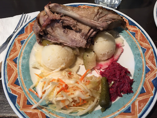 When I looked at the menu, I knew what I wanted to order, which was the duck dish. 2 of our friends ordered the cabbage rolls, 1 ordered the vegetarian rolls, and another ordered the chicken paprika. When our food arrived, I looked at my duck on the dish, which didn't look similar to the picture on the menu. I tried it out and the flavors didn't seem interesting at all. I also cut some of it for my friends to try. They didn't think it was anything special either. I also went to try out some of my friend's cabbage rolls and chicken paprika. Nothing special at all. Overall, the pierogis we ordered to share were probably the most delicious things we tried on the menu (Potato and Fried Onion) and that's saying a lot. The Sauerkraut was mediocre at best.