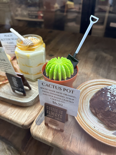 I've had my eye on this spot for a while but I'd always get scared away because of how busy it was. But thanks to the cold weather, no one wants to sit outside anymore, so I finally had an easy shot at getting a patio table today even though the indoor seating was about full (2 pm Sunday). Although I was happy to sit outside, I have to say the inside looked so cozy with the dark wood and comfy-looking chairs. The staff and even the other customers were nice, which added to the warm vibe. It was hard to make a decision on the food since they had a decent selection of vegetarian wraps and sandwiches, and everything looked pretty good. Their menu has Korean influence so they have items that are a little bit different from generic coffee shop fare. I went with a chickpea tofu wrap, the Tom & Jerry cheesecake, and a matcha latte. The wrap was a really good mishmash of flavours, grilled up nicely, and I also felt very healthy and satisfied after eating it. I didn't go in expecting to get the Tom & Jerry because I saw all these reviews saying it was underwhelming, but then I went in and saw it in the case... and it was so cute and it didn't look dry or floury, and the item description did appeal to me. I'm glad I gave it a chance because I thought it was a great cheesecake completely regardless of the fun shape. The lemon flavour was subtle but gave it a nice zing. I'm kind of wondering if the reviewers who said it was dry were just expecting it to be dense and creamy like a regular cheesecake because I actually found this to be more moist than other souffle cheesecakes I have tried. The soft and fluffy mouthfeel was so nice. I enjoyed my matcha latte but noticed that it was quite bitter. I'm not sure if their matcha is just particularly grassy or if it's the particular taste of their almond milk, which I noticed was not a brand I'm familiar with, but if you prefer sweeter things, even just lightly sweet, I would definitely request this sweetened. However, I thought the latte was made very well; the matcha powder was totally smooth and the latte art was pretty. I may have to make another stop here to try more...
