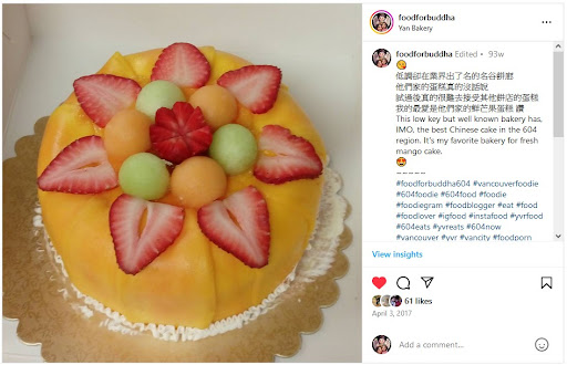 Read moreMy first time at Yan Bakery was in spring of 2012. I didn't know a bakery exist here because I seldom drive along East Hastings and I don't live in the area. Anyway, I was referred to this bakery by a friend who had her wedding cake made here. She said everything about the place was positive so I went there to give this place a try for MY birthday cake. I ordered blueberry mousse cake and it was just delicious! Ever since then I have been going back to Yan Bakery for more birthday cakes and wedding cake. The only issue I had was with the wedding cake as it arrived late because the driver had an incident along the way and Helen had to deliver the cake herself. Overall, I have positive experience with Yan Bakery.