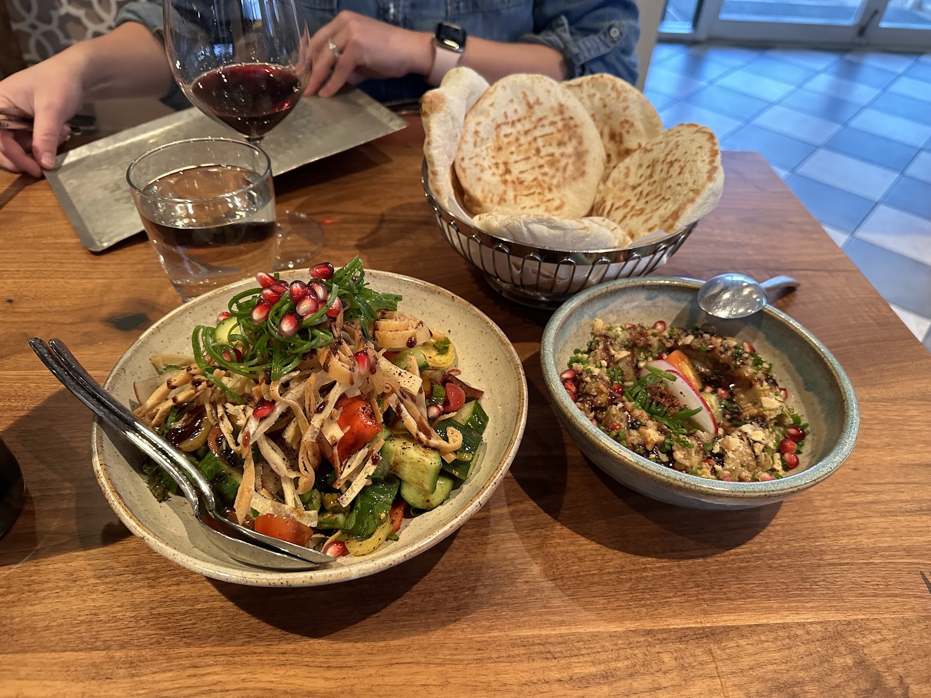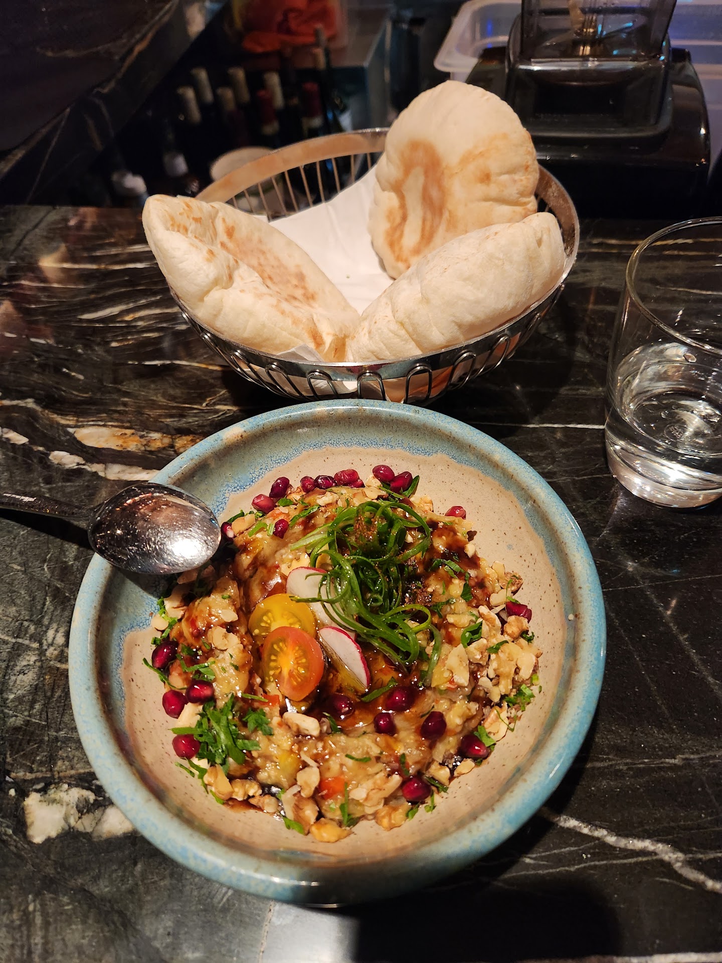 Food: Delicious overall and every dish looked like a work of art. So many different flavors, ranging from savory and fatty to crisp, bright, and spicy! We ordered the fatteh of the day ($25), the babba ganouch ($19), and the Aleppo kabab ($33). The fatteh of the day was a lamb fatteh ($25) which was described as their fatteh with ground lamb on it. -Fatteh: Their menu description of the fatteh is accurate for the ingredients, but doesn't do it justice for how it's made. The main component is hot yogurt mixed with whole chickpeas. Sitting below the yogurt is a layer of cut up pita, which absorbs some of the yogurt (and becomes soggy as a result). On top of the yogurt were garnishes of pistachios, crispy fried pita strips (almost like fried wonton strips), pools of ghee, cashews, and pomegranate pulps. While tasty overall with various textures, it was a pretty heavy dish (on the palate) and definitely not low calorie. It reminded me of a Mediterranean seven layer dip. The yogurt wasn't as acidic as I think it would have needed to be to keep the dish refreshing. -Babba ganouch: probably my favorite dish of the night at its price point. The flavors were interesting, there were various textures and colors, and we were given more pita to be able to finish all of it with. The portion was generous for the price. However, nothing really stood out in the dish as the various components kind of made a cohesive whole. -Aleppo kabab: the most delicious dish of the night. There were several components to it and it was fun eating different parts of it to refresh and give the palate some variety. The raw onions were spiced with sumac and were bright and spicy. The grilled veggies were nothing special but good nonetheless. The cucumber salad was also refreshing and light to contrast the meat. The kabab was fantastic, though I think it could have been salted more. It was basically spiced, ground lamb(?) mixed with pistachios, which complemented the flavor profile overall. Since there was not a lot of the meat, being able to eat the other components of the dish really let us savor it. Finally, I think the dish came with a tahini yogurt sauce, which tasted good with pretty much anything you dipped in it.