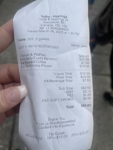 Read moreI waited a couple of hours before writing this, and was still very upset and I also read some other reviews from different people and it seems my friend and I experienced similar things. I usually come to the Cambie location and never have any problems but I had such a strange experience at the Hastings location. Arrived at this location at 11:56am, got seated around 12:20pm. The hostess and the person making the beverages at the front were super kind and friendly! Once seated we were promptly given the menu by the friendly hostess, then a male server came over and brought us water and gave us a couple minutes to order. He took our drink order first, and then said he would come back to take our food order. He never came back, another server came with our drinks shortly after and took our order. Everything so far is great! We ordered at around 12:30, we thought since it was busy the wait for the food was understandable, but we started to notice patrons who were seated and ordered AFTER us were given their food BEFORE us! We asked a different server and she said she would go ask the kitchen, came back and said our orders were coming in 2 minutes. If we never asked would our orders really come out in 2 minutes? The food came out at around 1:13pm. We ordered the buttermilk chicken and waffles benny and salmon benny- made into a bowl with a side of truffle potatoes. We aren’t sure since the salmon Bennie was made into a bowl if that made a difference but the menu says ALL Bennies include the herb tomato and the side of fruit. Buttermilk chicken did not have the tomato, and the side of truffle potatoes also didn’t come out until we asked for them. We didn’t want to risk another wait time if we had asked for the tomato or fruit, so we opted not to. Not sure if this was because we got our food right after we asked so maybe the kitchen just forgot something in haste but we noticed the truffle lemon potatoes didn’t taste as they did before. Instead of truffle lemon potatoes it tasted like we just got potatoes. Furthermore, not sure this is just a thing with making the Bennie’s into a bowl but considerably less salmon in the bowl than when I usually get it the regular muffin way. It was more of potato with a side of salmon. While waiting for our order no one had asked or noticed we were waiting for a considerably long amount of time. Yet we did see servers ask OTHER tables if they were alright or if their food was good. Very interesting observation. We also had initially ordered a 3 piece beignet order but we just wanted to leave after finishing our meal so we asked to cancel the beignets with the first male server. We paid and for the first time I didn’t include a tip, usually even if the service was bad I at least tip 10% but since it was only bad service SPECIFICALLY to ONLY our table of 2, it seems reasonable to me. This experience was really terrible. 3 stars for food as it came without some things (not sure if this was wrong or not but was already upset about the long wait time so the lack of things additionally dampened things) and the lack of truffle and lemon flavour from the potatoes and noticeable small salmon portion. 1 star for service because all of the above, the hostess and person at the front making drinks were lovely, to be fair the servers were nice as well? Just weren’t aware of us? Felt like they were ignoring us and only came over when we asked for help? 1 star for atmosphere because you start to hate it after seeing people get their food before you when you ordered before them. I really hope this was a one time thing, very...