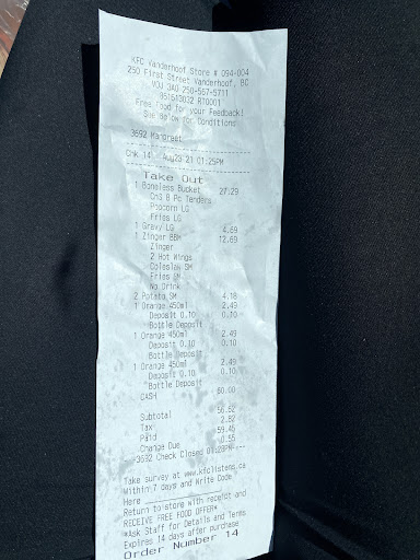 Read moreVanderhoof kfc is by far the worst location I've ever been to. They do not use the original recipe for their chicken which was soggy. The boneless bucket we got , had soggy popcorn chicken and dry strips. The cust.service rep. Completely missed an entire meal on our order And then gave me tap water when I asked for a bottle. There was no fork for the potato salad that they gave too many of. We ordered 2 zinger boxes; with salad one with bottles water the other with root beer we got tap water we only had one on our order. And we had a Boneless chicken box. A medium gravy was not an option. Furthermore I could not understand the cyst.rep. At all. Very poor English which is a huge barrier when repeating...