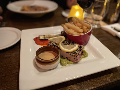 Read moreBel endroit chaleureux et joli, nous avons été agréable surpris par le calme malgré la présence et la proximité des gens. Le fond de musique était à un bon son. Malheureusement soirée très décevante dans son ensemble… Entrée de tartare de saumon bon goût mais demi cuit par l’acidité, la vinaigrette de la salade était cependant excellente. La bavette de bœuf ultra salée, si au moins la sauce aurait atténué. Tellement dommage pour une si belle pièce parfaitement cuite. Asperges aussi beaucoup trop salées. Belle fraîcheur des aliments. Le staff est très très jeune. Super savoir être, sympathique mais pas d’assurance qualité, jamais on nous a demandé si c’était bon sauf au moment de ramasser les assiettes. Dessert: trop de coulis inutile et déception pour les coulis de l’épicerie de caramel et chocolat. Donc sommes toutes nous n’y retournerons pas, mais bon potentiel. Amère de payer autant pour avoir manger du pain et un mini tartare de clairement...