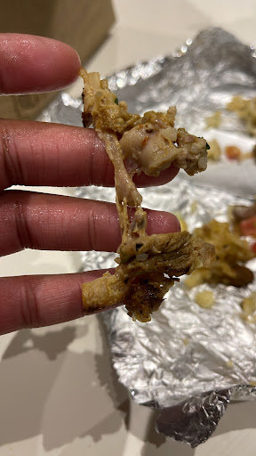 I have had a terrible experience from Uber eats. I placed an order on September 23 and I received my meal around 11:45 am for lunch time. I would prefer to give this 0.0 stars however on Google it will only let me put one star .Unfortunately The burrito I received was the most disgusting burrito Iâve ever eaten in my life. Unfortunately, there was a piece of raw gummy, hard cartilage, and bone in my burrito. I almost choked on it, and I immediately threw up five times. I am very positive and I donât post bad reviews for restaurants, however, this is unacceptable and needs to be seen by many other people. Iâm not sure who made this burrito today, but I would advise the manager and all staff to take a look and pay attention to the meat when they are cutting it up and putting it at the prep station. I donât think this is chicken and I donât think this is beef. Itâs not even meat. Itâs bone and cartilage and rubber this rubber thing attached to it.Something like this should never happen. I know from this experience I will not be eating at chipotle ever again.