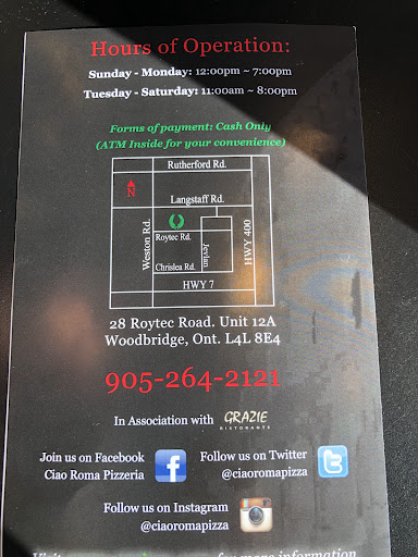 We literally left for the last time five minutes ago. With the biggest disappointment you can get from what we should consider business people. Here is the story: me and my kids wanted to go for some pizza. So we decided to drive to ciao Roma, on the way to it we tried to call to see if it was open because of long weekend. After listening to a very long recorded message, we had no chance to talk to somebody and no closing told. We found out from google that the place closes at 7, now itâs 5. So we decided to go. We get there and thereâs a family before us having pizza. After them we approach the server at the counter and we order a whole margherita pizza. And she goes âoh sorry margherita pizza is finishedâ and I said no I wanted a whole one. Then she told us that the kitchen is closed, so I explained that we tried to call so we didnât have to drive 25 km for a piece of pizza. But she said they were short in supplies. So I wonder if there is still an hour and a half and you had no more pizza to make, why donât you close the door and especially why donât you answer the phone. I donât think that in the future for us ciao Roma pizza a taglio wont be in our itinerary. Thanks for today have a nice long weekend...