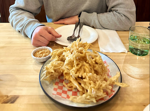 the taro fritters - came quickly and tasted so good!! the sauce it comes with has a delicate peanut flavour even though its a sweet thai sauce with chopped up peanuts, not over powering. and the taro fritters themselves were really light and didnt taste oily, battered well and full pieces of taro not just shredded.