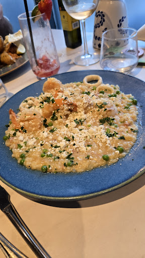 Food- The lamb chops were truly amazing. They were the highlight of the night. Cooked perfectly to medium rare with greek potatoes and tzatziki, oh so good! Friends ordered the seafood risotto and branzino. Overall, the food was good. We also had the grilled calamari which while super tender and delicious, still had pieces of the vertebrae inside of it which was kind of a turn off because it had the look and texture of plastic (i didnt even know that was possibile to find in calamari). We still finished it because the dish was great, but they really should make sure it is removed. I love grilled calamari and have had it in many restaurants and have never come across this before. Not a deal breaker by any means. We had the baklava cheesecake with the pistachio ice cream. It wasn't what I expected. It was basically 1 piece of cheesecake, a separate piece of baklava and 1 scoop of ice cream, seemed like 3 separate desserts. I've enjoyed a really delightful baklava cheesecake from Petros82, downtown and that had culinary excellence to it. But hey, if you like all 3 of these things in their own way, have at it!