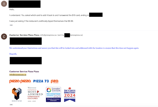 Then on Dec 19, 2024 I make a Pizza Pizza order at a different location and try to use the remaining balance on my $15 gift card. To my shock, it was $0. I thought maybe the balance may be on my $50 gift card then. Also $0. Surprisingly this restaurant from Dec 19 was actually able to show me both balances of $0 and also provided me a copy of the balances.