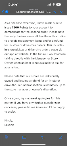 Someone posted a response they received from the “Guest Care Team,” and after reading through more reviews, it’s clear that this is the same generic copy-pasted reply sent to everyone. They aren't even caring about people's feedback, even on a health and safety level. “Each store is independently owned and operated…”, basically, it’s not a guest care team problem. So what’s the point of customer care if your only response is to deflect responsibility?
