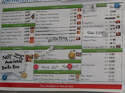 This is a small, unassuming little store front in the parking lot of home hardware. It was an interesting and unexpected type of sushi burrito as it actually used tortilla wrap with sushi roll ingredients inside (most of the other restaurants selling "sushi burritos" essentially sell uncut rolls but they are wrapped in seaweed). We tried the California sushi burrito and the teriyaki chicken sushi burrito. The California sushi burrito consisted of typical California roll ingredients such as imitation crab meat, avocado, Japanese mayo and rice. It was delicious, but seemed to be lacking a little in the amount of imitation crab meat. The teriyaki chicken sushi burrito had battered and fried chicken pieces with other vegetables and rice. It didn't have enough teriyaki sauce though, so it seemed more like just a normal crispy chicken wrap with Japanese rice. Pricing seems a little expensive for the size of the burritos, but I would come back as it is good road trip food for...