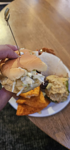 I had no room to try their pizzas but it looked absolutely delicious. Hands down best fish tacos 🌮 I had tasted, and trust me, there are a couple of places in town but something about the ones made here blows the taste buds out of the water; my regret was that I grabbed only two when clearly I should have grabbed half a dozen to a dozen. Their chicken and beef sliders are scrumptious (I had 4 chicken on site, 3 beef as takeout to eat the next day). Their salad is delicious, their dips are out of this world, and I love the offering of olives. Everyone in the group were offered two drink tickets to anything in the bar menu; I order one large glass of white wine & one large glass of red wine.