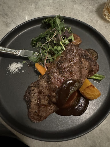 We each got the 10 oz steak, fingerling potatoes and veggies. I found it very strange we were given slightly serrated butter knives instead of steak knives. As ridiculous as it sounds it really took a long time to even cut the stems of the broccoli let alone the steak. The Demi was delightful. The dish was ok. Everything lacked seasoning, though, and the tables did not have salt or pepper. There was a small pinch of coarse salt offered on the plate. Quite underwhelming at $50/plate.
