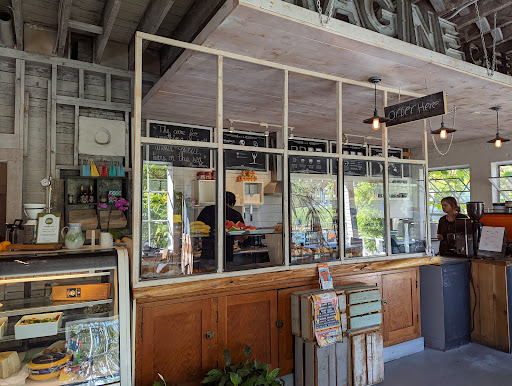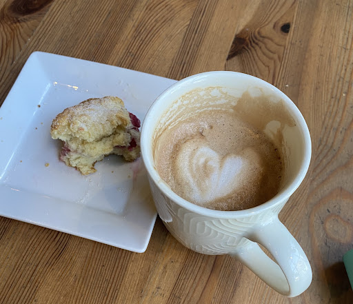 Read moreI’ve passed by this place many times, always telling myself that I would like to try it “someday”. I have now been several times and it has become a favourite destination for hubby and me to go for our Saturday morning coffee date. The atmosphere is rustic, cozy, and charming. The in-house baked goods are phenomenal. The last two times I have had the raspberry scones - fresh raspberries and incredibly fluffy scones: perfection. Hubby has gone for the cinnamon bun. It’s beautiful (see photo), with a dollop of what I believe is buttercream, rather than the usual cream cheese frosting, and a spike of caramelized sugar on top. The buttercream is not as sweet as the usual frosting, which makes a perfect complement for the sugary pastry. I really want to try the pizza; every time we come, we see the ingredients sitting out in front of the pizza oven: purple and Roma tomatoes, cheese-laden flatbread, and a huge tray of chanterelle mushrooms. The display case of lunch items is tempting as well. Of course the coffee is wonderful as well. The mocha and flavoured latte is much less sweet than that big coffee chain, so you actually taste the perfectly roasted coffee. The latte art is so skillfully done that it lasts all the way to the bottom of the cup. The only downside is that it opens later than most: 10:00 on the weekends and 9:00 on weekdays. Come when they open and you get warm pastries, so that makes up for it! I highly...