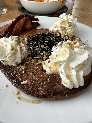 Read more⚠️Warning: If you have alergies, this place may not take them seriously!⚠️ This place is quite charming, in that it is in an old Victorian home, but it did not live up to our expectations in terms of food and service. My wife disclosed to the server that she has an alergy to green peppers and red onions, and asked if the soup of the day had any of those ingredients and his response was to shrug his shoulders and say "Maybe." Later the kitchen determined that it could have red onions, so another soup was substituted. We each ordered the oatmeal pancake. The options included bacon or sausage. My wife ordered the sausage option, and after taking a bite, discovered it started to bother her throat. We asked for the ingredient list, and low and behold it contained jalepeno peppers which would fall under the green pepper category. The oatmeal pancakes themselves were overcooked and dry and quite crispy on the edges. They didn't look like the photos that other reviewers had shared. We ordered the sweet and salty lattes, and asked how much honey was in each serving and the server told us "two teaspoons". When sipping on the lattes, the honey was undetectable, certainly not two teaspoons and we didn't get the salt until we got to the dregs in the cup. Overall I give this establishment a thumbs down and wouldn't visit again. The servers attitude and lack of attention was inexcusable, especially considering that the cheque showed his name with his title as...