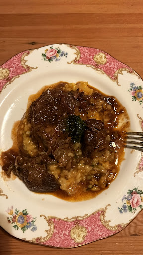 Also they made accomodations for the husband's gluten sensitivity. He skipped the Wagyu meatballs and had seared Wagyu slices with mushrooms and a white sauce. He also skipped the squash ravioli and had a vegetable risotto with [we believe to be] pork slices? The husband said the risotto was like a bunch of leftovers put together in the back.