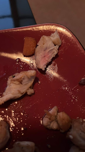 On se lève et on va payer au comptoir et le chef proprio revient encore nous voir! Il nous engueule encore et la il nous dit que c est la sauce ketchup qui a coloré le poulet. On lui dit qu'il n'y avait même pas de ketchup à notre table. Il nous répond que c'est une des sauces à part dans l'assiette qui a coloré le poulet. Ma conjointe avait essayé les sauces en début de repas et ne les avait pas aimé car ca goutait excessivement le vinaigre de riz. On lui dit qu'on n'a pas pris de sauce qui en plus sont brune pour une et orange/rouge pour la 2e, alors que le poulet cru est rose. Il nous répond que c est la sauce pendant la cuisson du poulet qui l'a coloré, donc après nous avoir dit que nous avions apporté du poulet qui ne venait pas du restaurant, maintenant c est SA cuisson avec sa sauce qui était problématique... bravo champion. Il nous a dit que ca fait 35 ans qu'il est chef et qu'il n'avait jamais vu ce genre de poulet. Je lui ai répondu que mes parents sont diplômés de l'ITHQ en cuisine et chef et que je savais reconnaître du poulet cru.