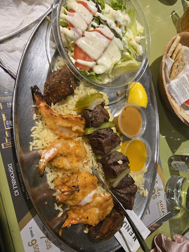 Les deux nous avons constaté que le ris dans l'aciette était dur, frois et sec. Il goûtait le riz en canne.Nous avions deux patates grec sèche et grumeuse. Lorsque la seuveuse est venue nous voir pour savoir si sa allait, je lui est alors demandé si elle le mangerais cette patate et elle a eu un jolie moment d'hésitation en me disant que c'est de cette façon qu il préparait les assiettes. Elles étaient grumuses sec et sans goût. Lorsque je me suis levé pour aller voir le chef dans la cuisine avec mon assiette la serveuse c est mise à courir après moi pour me dire que je n'avait pas le droit de rentré dans cuisine et que le chef ne me parlerais pas ... Sa en dit long...