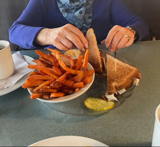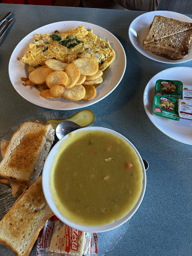 My wife and I came here today for the first time. I had never heard about this restaurant, but I was in the area and wanted to try it. There is plenty of parking. It is a relatively large restaurant, the server was fantastic. She was very polite and attentive and prompt with our meals. It took just over 10 minutes and we were served our lunch. I had the special which was a grilled cheese and chicken sandwich with ham and split pea soup (soup could have more real ham chunks in my opinion) but was still tasty. My wife had an omelet thin sliced potatoes with toast and it was excellent. The coffee was really good as well. It is definitely comfort food, but it is very satisfying. If that’s what you’re in the mood for I felt the prices were very fair. The service was excellent. The restaurant is a little bit older, but well maintained. I’d like to go back again and try some other menu items. It was a nice...