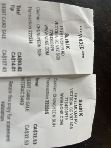 Read moreBIPOC be wary of the customer service here!!! I am a driver with a delivery service. I was on the phone with a friend who is black and also does delivery while he was picking up from sushi k, he asked to use the bathroom and was denied. When he questioned why he couldn’t, the staff replied that they were scared AND a customer also stepped, so three people yelling at him at the same time… all for enquiring why he is not able to use the bathroom. The next day, I had a delivery from this restaurant and I asked to use the washroom, she told me I could use it. I asked if she worked the previous day and so I told her that I witnessed her interaction with my friend. She tried to tell me that he was aggressive and scaring the staff and when I told her that I was on the phone and knew this wasn’t the case, she changed her story to not letting people use the bathroom because it gets messy to fast. The food might(??) be decent, but I do not recommend this...