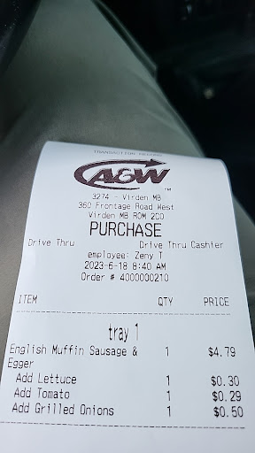 Read moreTravelling thru, stop in around 6am. While ordering a breakfast wrap and sandwich, decide on two sandwiches instead but was told the wrap was already made (10sec later, before even paying) so we can't change our order. Get our food, the wrap was a tiny tortilla with grey egg, kraft single, bacon, and ketchup. Sandwich was muffin with egg, cheese, ketchup. The egg on the wrap gave food poisoning. Spent too much money on the worst food of our life. Won't return and will probably skip every A&W breakfast...