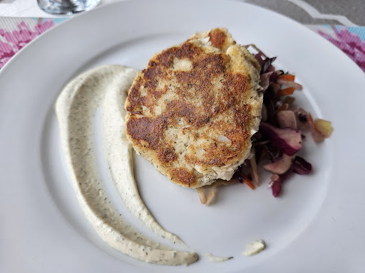 My husband and I ate here last night for the first time, and I can honestly say that it was one of the, if not the best meals I have ever had. Started with the crab cakes. INCREDIBLE. They were served with a house made tartar sauce and shaved cucumbers, and the combination was perfection. My husband hates..... cucumber, but cleaned his plate. For the meal, I had the Halibut fillet with a lobster risotto. The Halibut was outstanding. Cooked to a perfection. It literally melted in my mouth, and the risotto, omg. My husband had the Halibut cheeks with saffron rice. Dear Lord, help me, lol. Unbelievable flavors. When I thought it could not get any better, I begged the server to tell me the desserts were not homemade, but they are. Dammit.... We shared the chocolate cake and was very disappointed. That I shared...... unreal. The cake was moist, and the icing was not too sweet. It's just perfect. The service was amazing. Friendly, knowledgeable, and sincere. The chef was fantastic, not just for his talent in cooking but for his service. He brought out our food, then checked on our meals. Truly the best in all aspects. It is now our favorite place to eat, and we will back every chance we get. That's all we could talk about on our way home and again this morning when we got up, lol. It was a 40-minute drive for us, but we would drive for 3 hours to go there. Honestly, it's the best place to go. I strongly suggest to everyone to go. I would give this place a 20 out of 10. Thank...