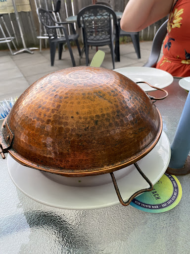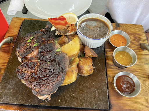 Our visit here was back and forth good and bad. For starters, I called a couple days in advance to make a reservation. This was to be our first time out to a restaurant since the pandemic started, so we were excited. When we arrived, they greeted us by name, which was a nice touch. But then we discovered our reservation was for the patio, not indoor. They have decided to keep their indoor closed. If you like patio dinning, I guess that would be fine, but we did not want to eat outside with flies buzzing around all over. We asked to be moved inside, but they said no. This was a real let down. We ordered right away, and asked for garlic bread to start. It took 20 minutes to arrive, so judge that how you see fit. The garlic bread was absolutely excellent though! I'd give it a perfect score for sure. Our entrees arrived 25 minutes after that. First was the caesar salad. The presentation of the salad is baffling. The romaine heart is trimmed and cleaned but otherwise totally intact and in one piece sitting in the middle of the plate. The caesar dressing is drizzled on top in a zig zag pattern, and then in two little pools on the plate on either side of the romaine. Some sausage bits are sprinkled on top. I honestly wasnt sure what to do with this, and I actually had to ask the server. He brought me a knife so I could chop it all up myself. Once we got eating it though, it was easily the best caesar salad I have ever had. They make their own dressing, and my big regret is not buying a bottle. This salad was so good that I kept eating it even after my steak had arrived! My wife ordered the tiger shrimp piri, which she said was good but she was unprepared for how spicy it would be. They do give you a stack of bread with the shrimp piri, but no butter for it, and they do not have any available if you ask. My steak arrived on their signature granite slab, and I have to admit that is a slick and effective presentation. It is nice how it keeps your steak warm for you - especially handy when you're stuck out on a patio. I ordered the new york strip, and it was ok - not bad, but not awesome. Actually, it was a little flavourless and I found myself dipping it in the bbq sauce they provide, which tasted like store bought bulls eye sauce. I usually never use bbq sauce in a restaurant, but it just didnt have much flavour. The steak comes with potatoes, which were nicely seasoned but very dry. Some butter would have helped them out a lot. To drink, I ordered a long island. It was fine, but I was surprised when the bill came: I had misread the menu and thought mixed drinks were $9, but the long island is actually $16! I would not have ordered it had I realised that. For dessert we had the famous custard tarts, and those alone would be worth the price of admission. We shared a plate of 4, and my only complaint is that there weren't more! Most reviewers comment how expensive this place is. But "expensive" is subjective. Here's what we actually paid: $6 for table water, $14 for garlic bread, $17 for the caesar salad, $25 for the shrimp, $46 for the steak, $16 for the long island, $5 for a glass of juice, $12 for the tarts, and $6 for a coffee. Subtotal was $147, $166 after tax. That's probably about 25% higher than I would have expected, but the real problem is that sitting outside on plastic furniture, it just didnt feel like good value. Bottom line, it was a good meal over all, and I think most people could have an enjoyable evening there so long as they're prepared for the not-so-good parts.
