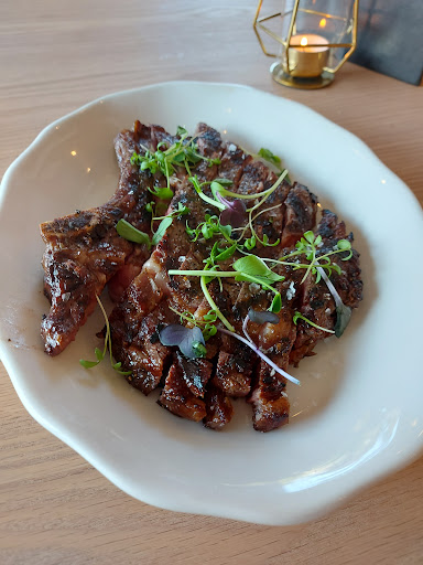 I ordered the bone in rib-eye steak and the meat was so tender and perfectly charred. On the down side it was a bit aggressively seasoned and I really don't understand serving it bone it but then pre cutting the steak into strips and the microgreens on top were completely unnecessary. That said I devoured it all quite happily.