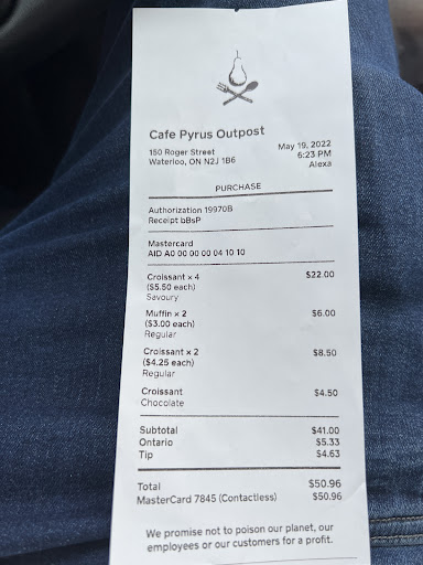 Read moreI went to get some food from them. They charged me 10% tip on my order without asking me. I later confronted the girl on counter and she said that they take 10% tip from everyone and it’s written somewhere on the board, I asked her to show me on the board because there is nothing like that written on the board and you can’t take 10% tip from everyone forcefully. Then she said that we don’t get option on the computer to not add the 10% tip on any order. After that I told her that show me what options it shows when you take order and it had No tip option on the screen. I told her that you have the option to select No Tip so why did you not do it, then she was like I can give you the refund, I’m sorry. I told her that I have been to Kitchener cafe pyrus also and they never charged me like this. I dint take back the refund from her but that’s very unprofessional of her. Whoever goes there just be careful of this thing. Most funny thing is that on the bill they write we promise not to poison our planet, our employees or OUR CUSTOMERS FOR PROFIT.😂 See the photos I’m adding you will see it...