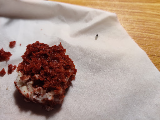 However, what really made me post this review was the fact that I found a fly INSIDE my cake today. I bought a slice of red velvet and halfway through eating I saw a fly crawling out of it (black dot in the photo). I'm absolutely certain it was from the store as we never have these specific types of flies in our home. Felt disgusted afterwards.