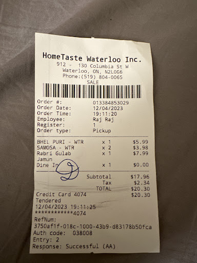 Read moreWhen celebrating Diwali, it is difficult not to feel homesick for India - the rangoli designs, the decorated balconies, and best of all, the home-cooked snacks! Once such restaurant to remind us of home was Hey opened eatery on oe of Waterloo busiest). A street, HomeTaste is best known for its wholesome thalis, Indian-fusion burgers, and mouthwatering chaat dishes. Hoping to try their signature dishes, we ordered the chole bhature, samosa chaat, and aloo tikki chaat. While the flavorful chole were simmered in a rich blend of spices, the quality of the bhature was wanting. Despite being soft and fluffy at first, when left for a while, they lost their tenderness and had transformed into rock-hard discs. However, the top-tier samosa chaat and aloo tikki chaat saved the meal and left a good impression overall! The well-crafted samosa chaat featured golden-brown samosas, generously filled with spiced potatoes and peas, wjile the aloo tikki chaat had flawlessly fried potato patties, creating a delightful contrast of textures. Topped with a medley of chutneys, yogurt, onions, and crunchy sev, they offered the perfect blend of savory, tangy, and spicy flavors in every bite. Should you find yourself craving Indian street food while on Columbia Street, this is definitely a restaurant worth checking out! With a wide range of dishes including both, authentic Indian food and Indo-Western fusion dishes, you are sure to find something to your liking here. Highly recommended for your next celebration!