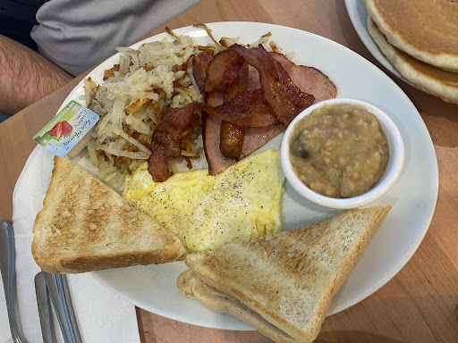 My partner ordered the Mega Breakfast which came with two eggs, hash browns (shredded potatoes), toast, sausage, bacon and ham with a side of oatmeal in addition to pancakes. You can opt in for French toast instead of the pancakes. He enjoyed his meal overall. The portioning was good. He didn't get a chance to try the oatmeal so I can't provide feedback on that.