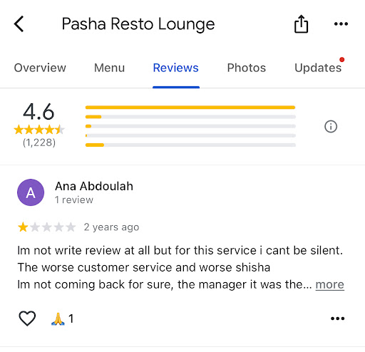 Read moreterrible service. We went there for my friends birthday and we ordered a shisha with ice pipe and there was no pull. We asked them and the guy came and switched out the pipe. Still no pull and it was burnt, so we asked them again if itâs ok if they fix it. He came back said he would switch the whole shisha (both times they tested the shisha and knew there was something wrong). He brought it again and we tried it. After 5 minutes it was burnt. They left no tongs so I grabbed tongs and rearranged the charcoals (I know how to use a shisha as I have a few at home, I promise this wasnât us being amateurs). Still it was burnt no matter how we arranged it or took off the charcoals. At this point 40 minutes have passed and we still had no working shisha. We had to leave to go home and we are telling them this is not acceptable. This lady and another gentleman is telling us we have to pay, but we tell them all we have had is 5 minutes of burnt smoke. The owner eventually came and after we explained he let us go. But staff handled this terribly and treated us as if we are just trying to dine and dash. We had come here frequently in the past and are regulars. This ruined our night for something that shld have been a simple service. At the end we even told them to try the shisha and see how burnt it is, we were coughing up a storm. They themselves didnât even want to try it.. I think that...