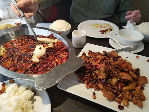 Service was actually the worst I've ever experienced. My boyfriend ordered shrimp soup and spring rolls. I got eggplant and dumplings. They brought out our shrimp soup and eggplant, but then they just forgot about the dumplings and spring rolls (which should have been appetizers) and every staff member there came and sat down to eat. Keep in mind this was around 1 and they are open 11am-11pm so it's not like we came when they were closed. After a little while we finally got their attention and they Jumped up and ran to get the spring rolls and dumplings. The spring rolls were burnt as heck and the pork dumplings were something strange. There was too much dough and it was undercooked and chewy. They were sweet, and there were maybe 3 strands of ground pork in them. We didn't complain, since they ALL went back to eating at their table. My eggplant was good, but my boyfriends shrimp soup? The shrimps were not deshelled. They still had legs, and it was almost impossible to eat them. It was a mess because this is soup were talking about. He had to deshell the shrimp by hand, and get soup everywhere. Not to mention there were way more chilli peppers than shrimp. We're both good with spicy, but NOTHING needs to have more than 20 chilli peppers in it. Would have been cool if they actually described the food . We had to use a translator app to read like half of the menu, as it was in chinese. Even still the words "chicken noodle" or "shrimp bowl" aren't particularly descriptive. Overall, this place is absolute crap. Don't go unless you like overpriced spicy...