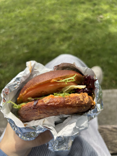Their drinks are way better than you’d expect from a campus cafe. The chai latte and matcha latte are both so good. But my favorite thing is the Build Your Own Bagel. You can customize it however you want with a little paper form, and it’s super affordable; usually around $5 for a full sandwich that’s actually filling. The pretzel bagel is my top pick, but it does sell out sometimes. My usual order is the pretzel bagel with sun-dried tomato cream cheese, honey mustard, spicy pickled peppers (I think they’re banana peppers?), lettuce, onion, provolone, and sometimes tomato. It’s seriously so good.